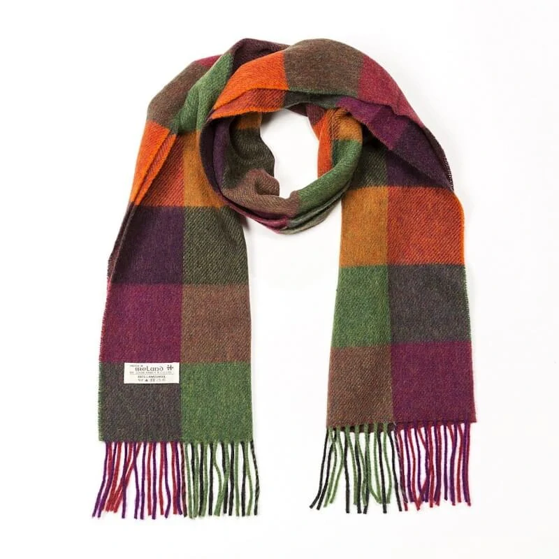 Kostkovaná šála Maroon Green Grey Check s třásněmi z jemné 100% z irské jehněčí vlny. Šála je velmi příjemná a slušivá, rozsvítí každý váš podzimní či zimní outfit.