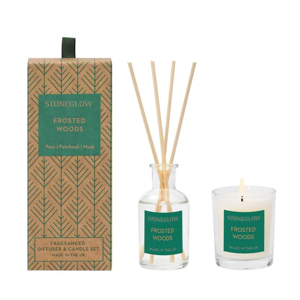 Vonná sada Frosted Woods, svíčka 75g a mini difuzér 50ml - Stoneglow Candles